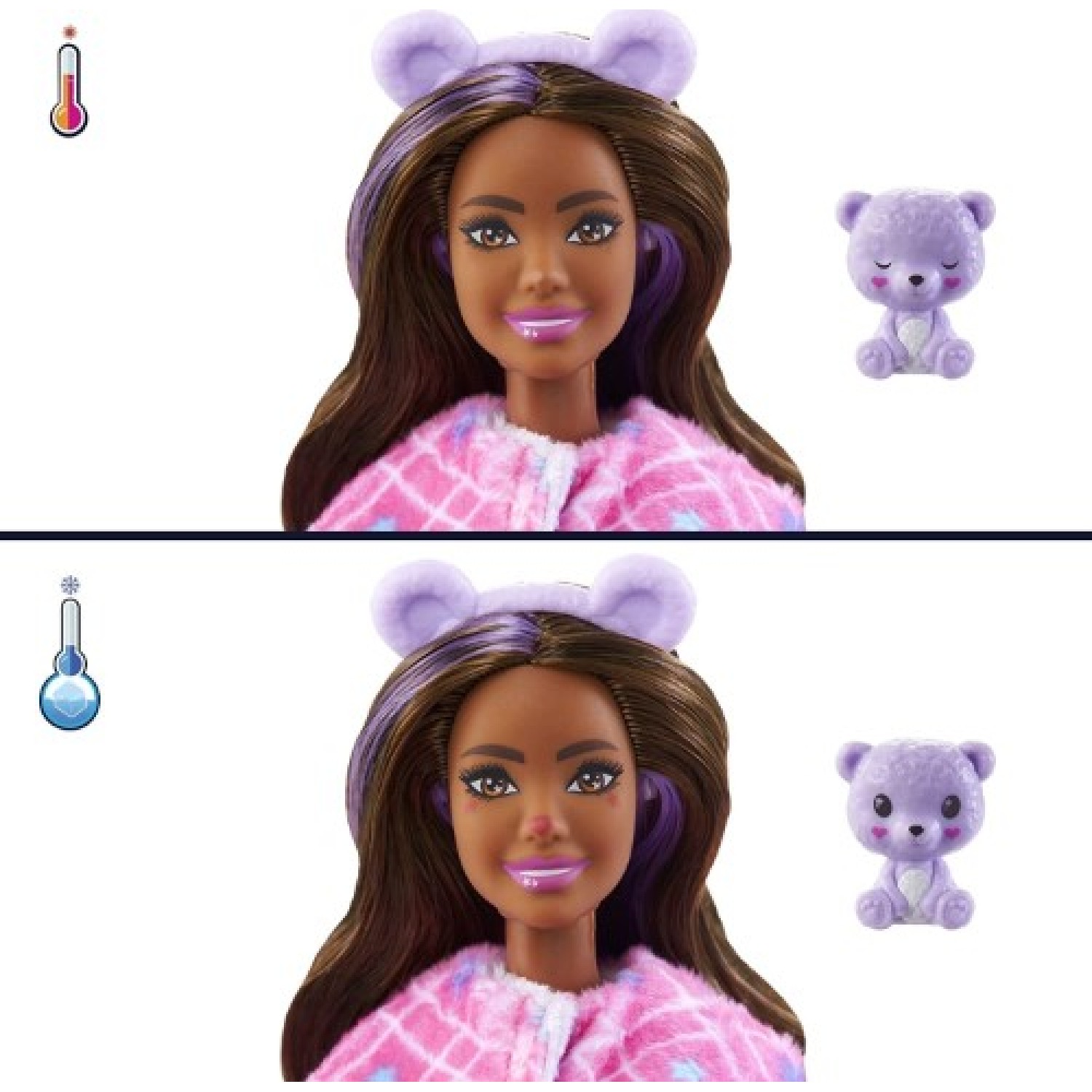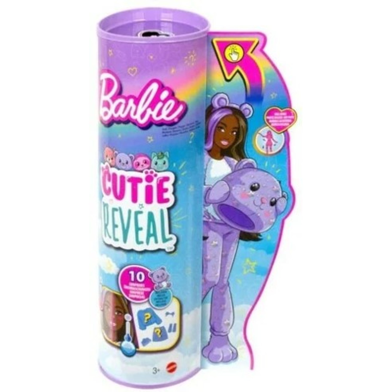 Barbies de Fantasía "Cutie Reveal", que vienen con 10 sorpresas en su interior que descubrirás al sacar del empaque ropas y accesorios con temática animales de pelaje suave. La muñeca Barbie es articulada. Incluye disfraz para Barbie con diseño animal de felpa con máscara para Barbie, accesorios y vestuario adicional para personalizar la muñeca. BARBIE CUTIE REVEAL OSITO (Teddy Bear).