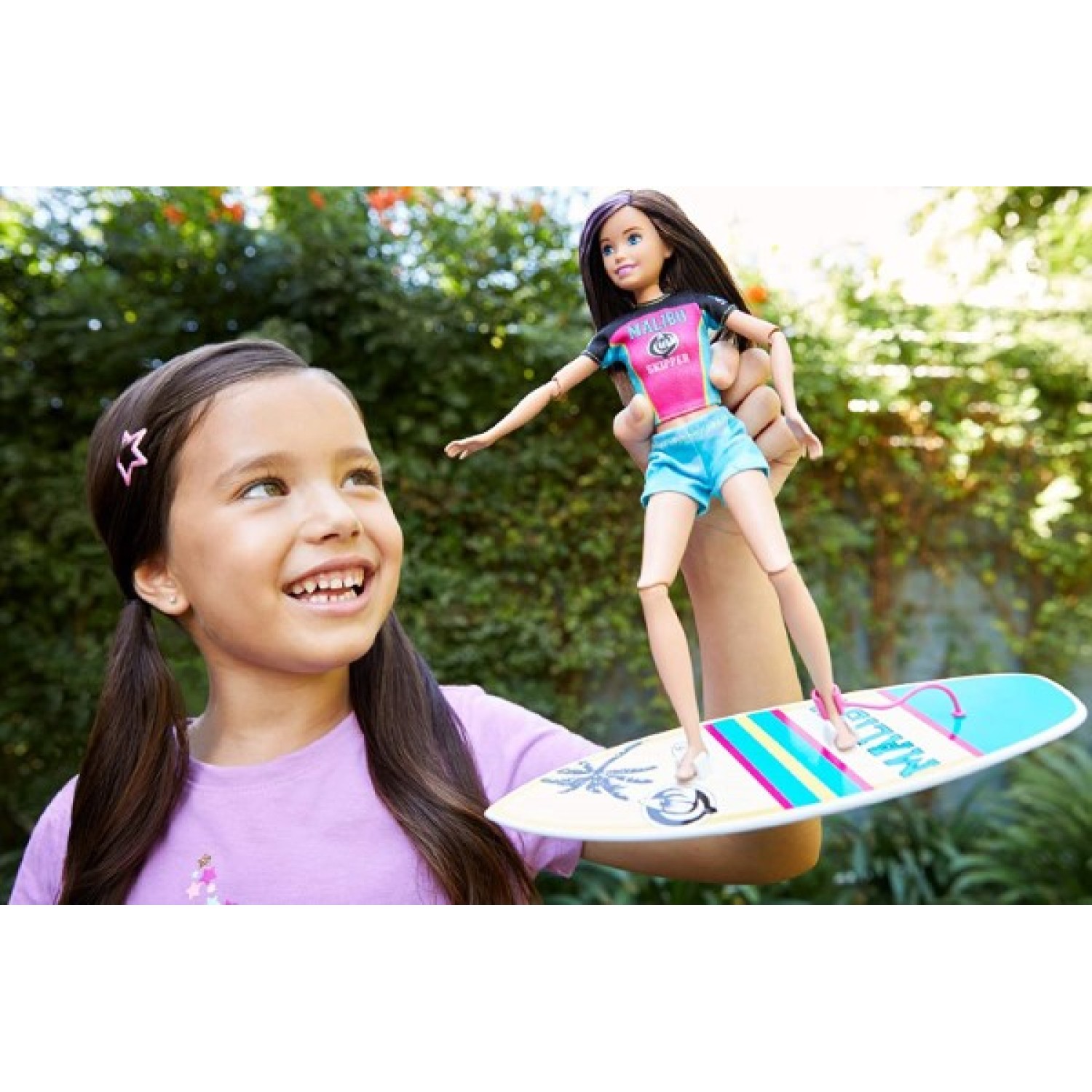 Su hija puede imaginar estar surfeando en playa con esta divertida muñeca hermana de Barbie. Muñeca articulada que mide alrededor de 25 cm, que viene con sus chancletas, tabla de surf y medalla.