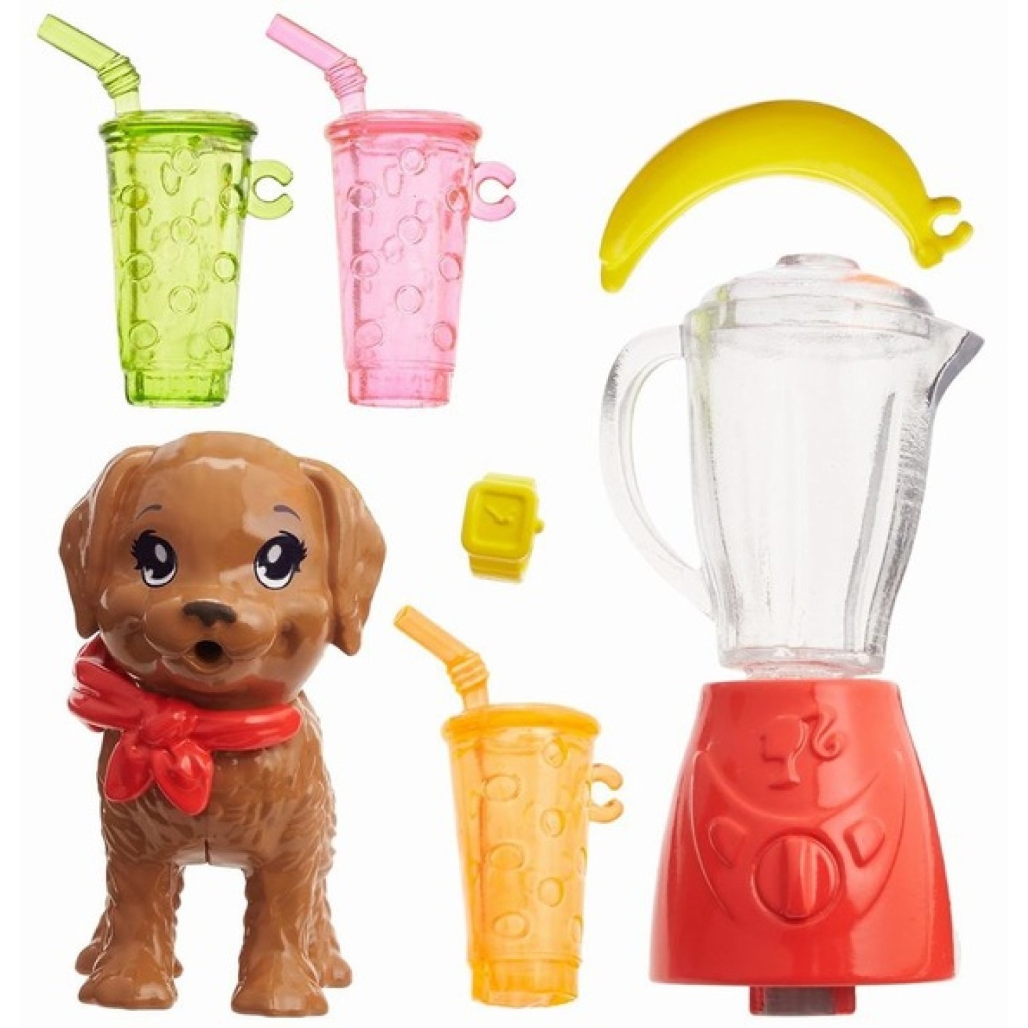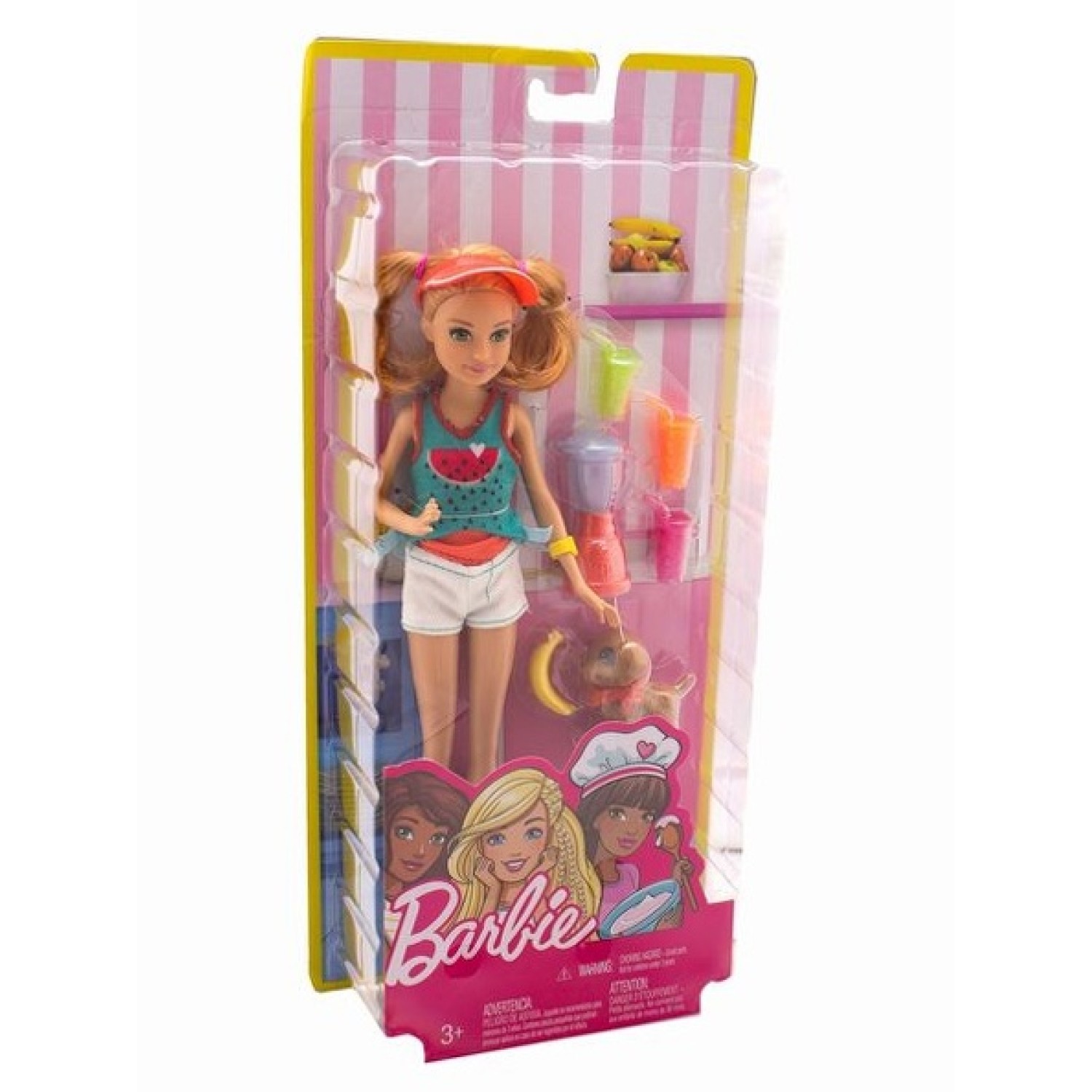 Las hermanas más jóvenes de la muñeca Barbie están listas para divertirse con sabrosas golosinas y un compañero de cachorro para ayudar a cuidar la tienda. La muñeca Stacie celebra bebidas afrutadas vestidas con un tanque de sandía, tiene un perrito con pañuelo a juego y viene con una licuadora, plátano y jugos.