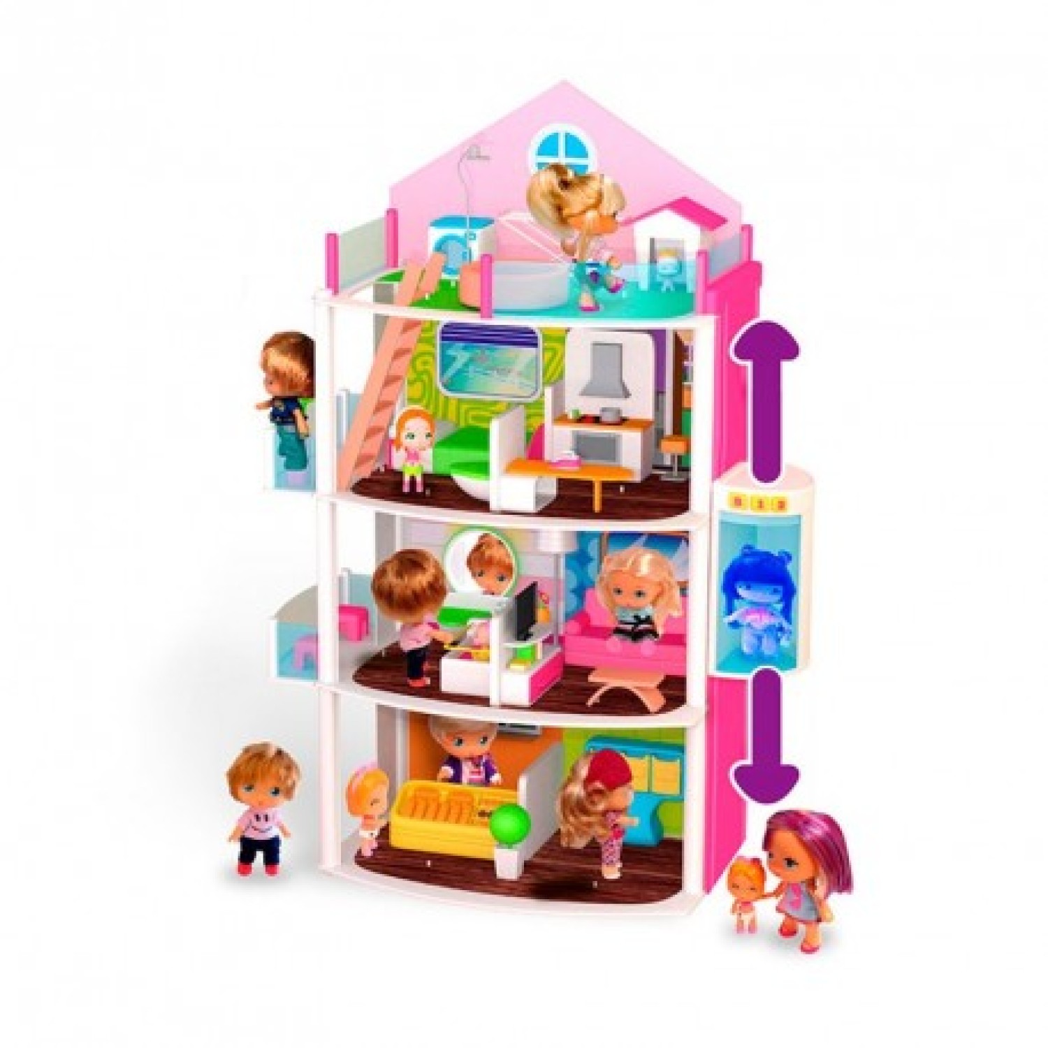 Gran edificio que mide 70cm (altura) con 3 plantas, ascensor y accesorios. Incluye únicamente 3 muñequitas.