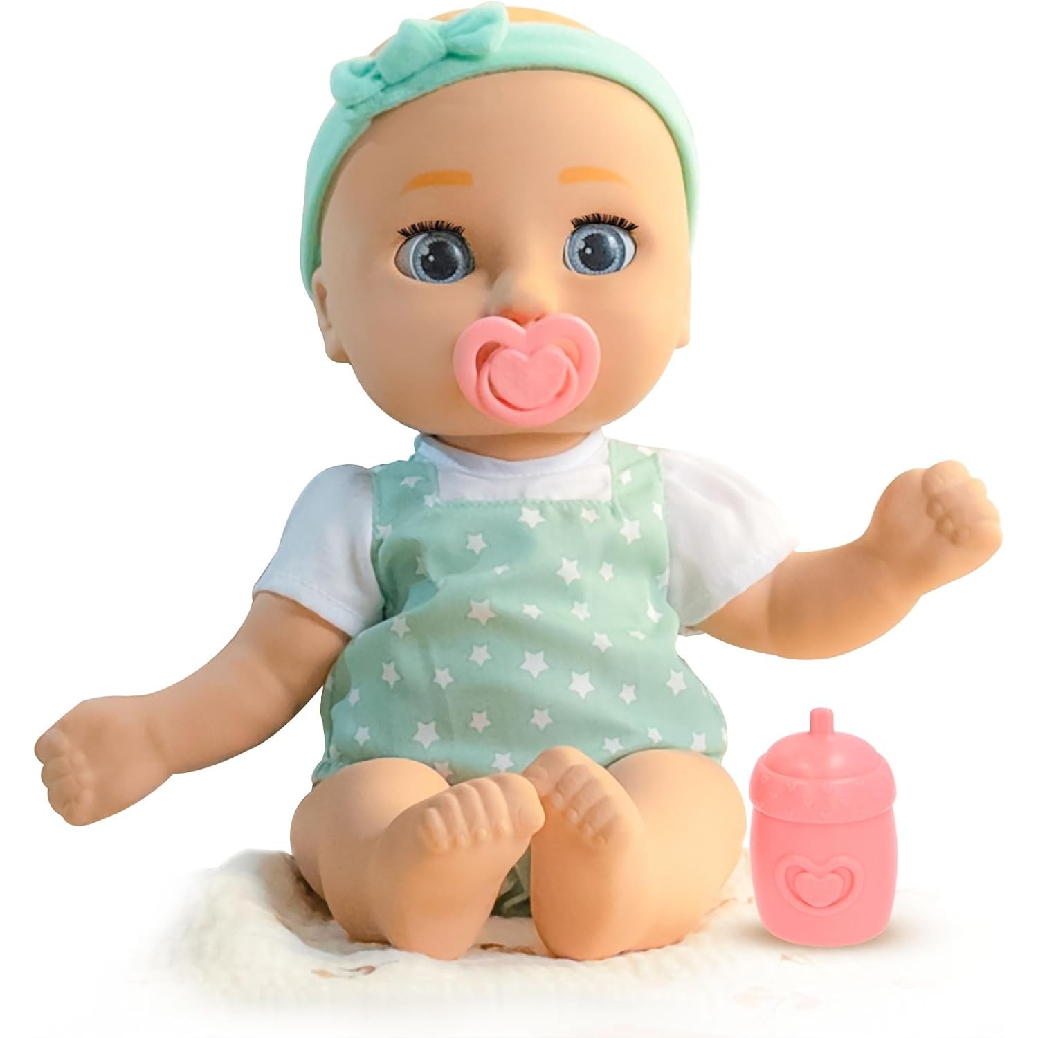 Muñeco articulado que mide 38 cm de altura con una textura de piel muy suave, que abre y cierra los ojitos como si fuese una bebecita de verdad. Incluye tetero, chupo y balaca.