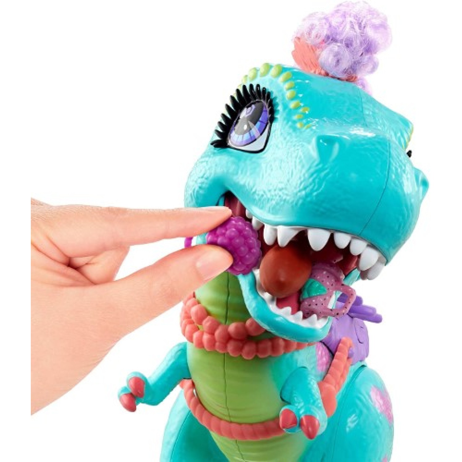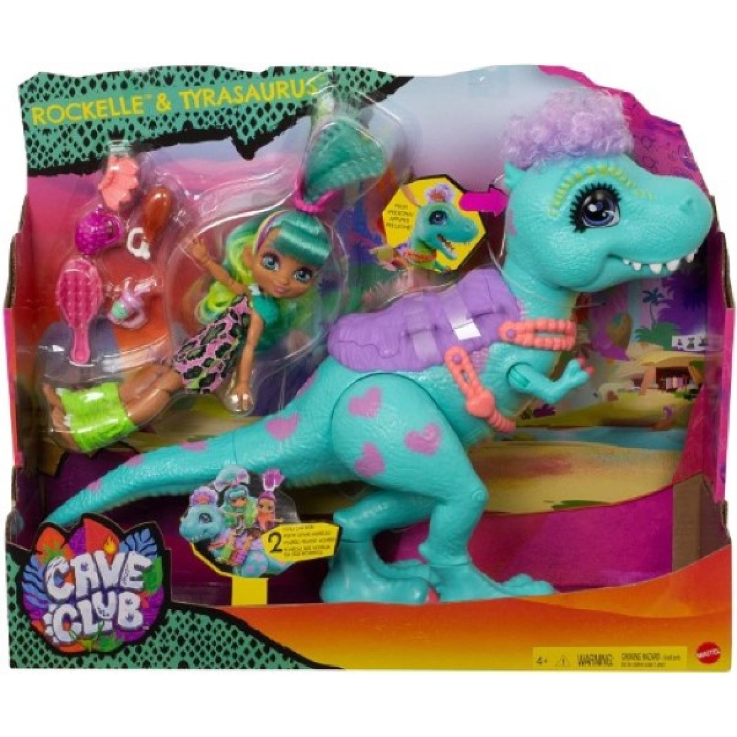 Muñecas Cave Club; grupo de amigos prehistóricos, muy inquietos y adelantados a su época. Rockelle y Tyrasaurus son mejores amigas. Puedes sentar a Rockelle a la espalda de Tyrasaurus y acoplar las piernas en su sitio, para compartir un maravilloso paseo. Presiona la palanca en el cuelllo de Tyra, para que mastique su comida. Además, puedes peinarlas y darles el look que quieras. Incluye accesorios para jugar y dar de comer a la mascota. La silla de montar cuenta con 2 plazas para montar a Rockelle y otro compañero de aventuras. Artículo importado.