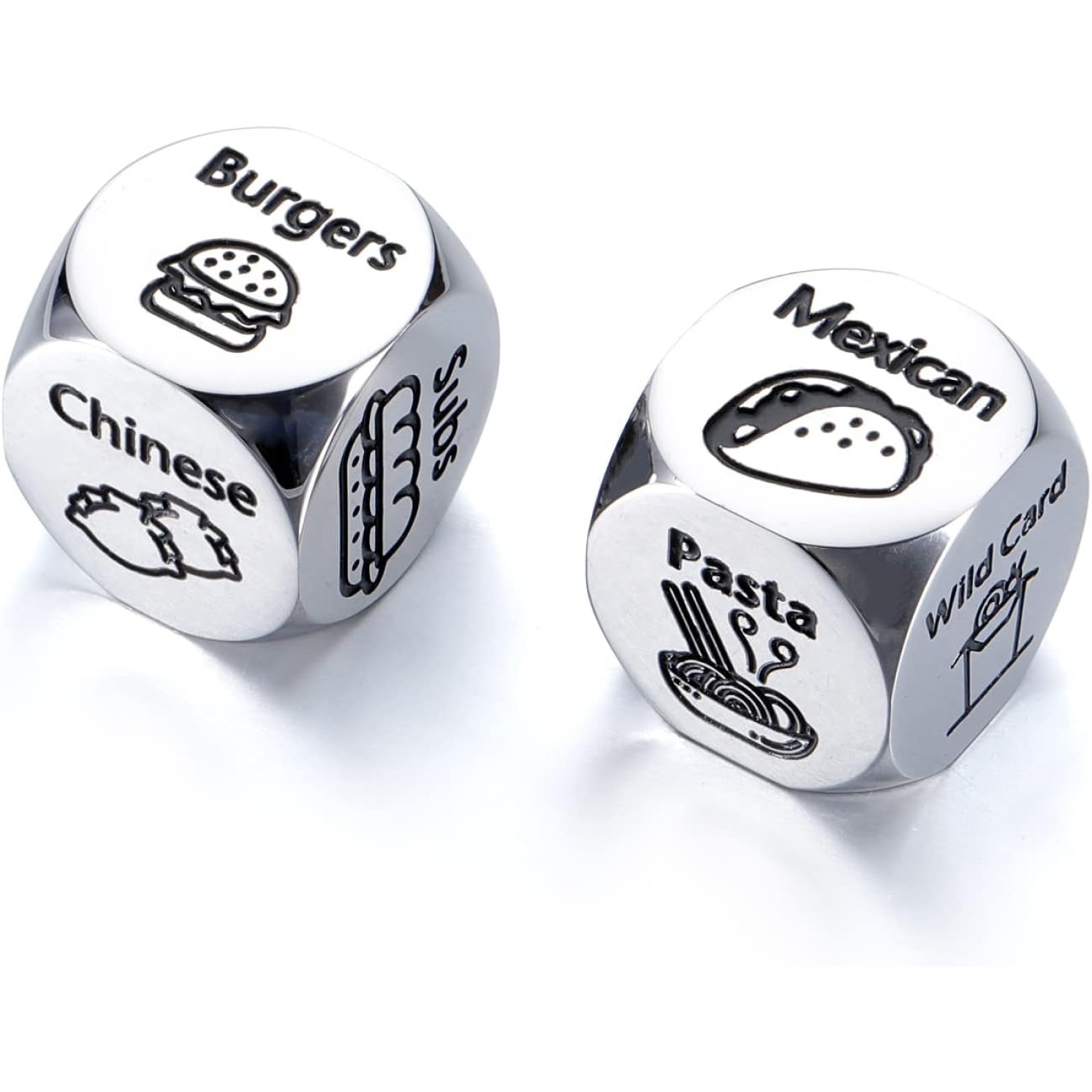 Obsequio romántico cada uno con 6 divertidas opciones para salir a comer en sus caras. Agita y suelta los dados para decidir qué comer: Hamburguesa, Comida mexicana, comida china, etc. Fabricados en acero inoxidable. Medidas de cada dado: 1.65 cm x 1.65 cm x 1.65 cm. Cantidad: Dos (02) dados.