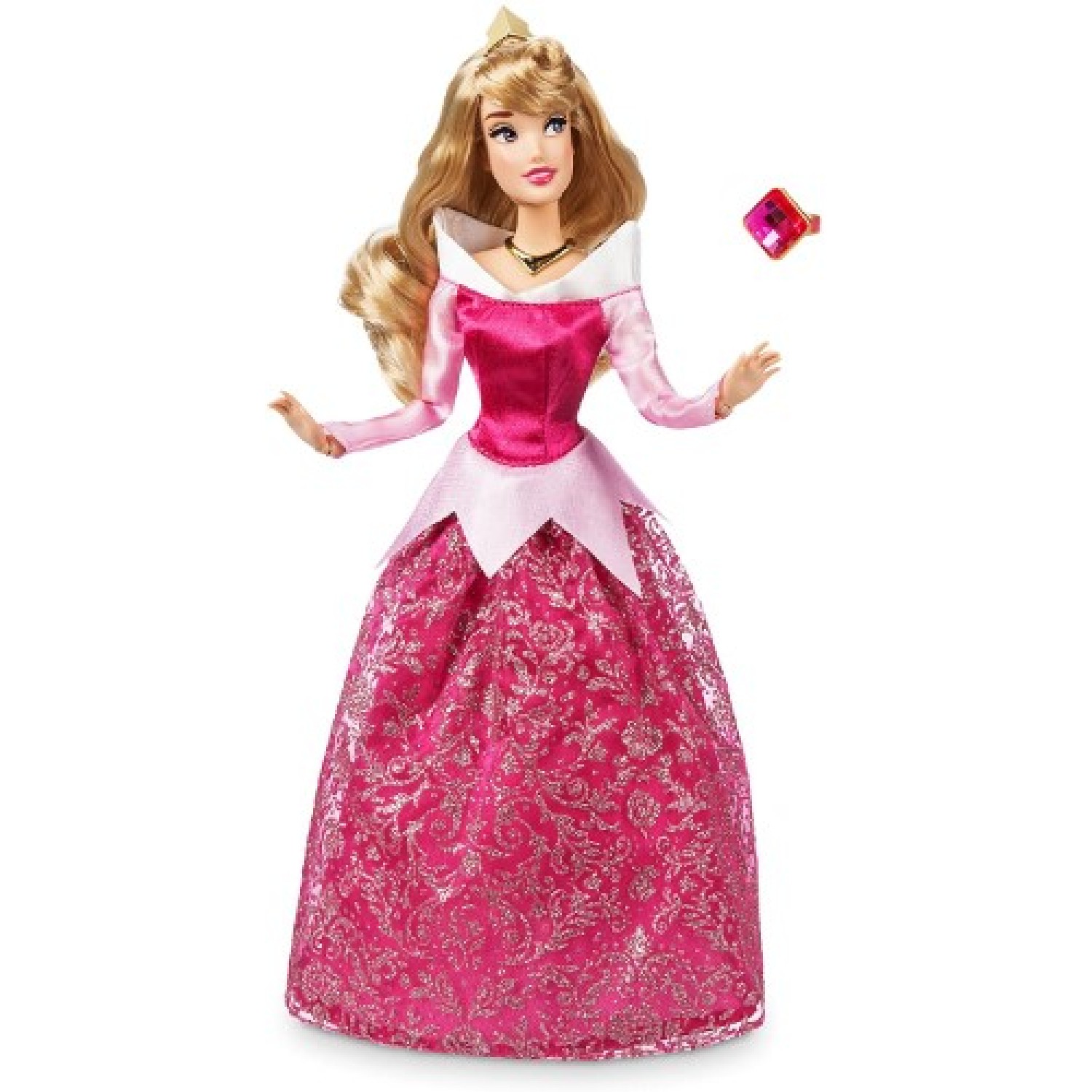 Muñeca articulada que mide alrededor de 28 cm, vestida en su atuendo emblemático con aplicaciones de escarcha y anillo de obsequio.