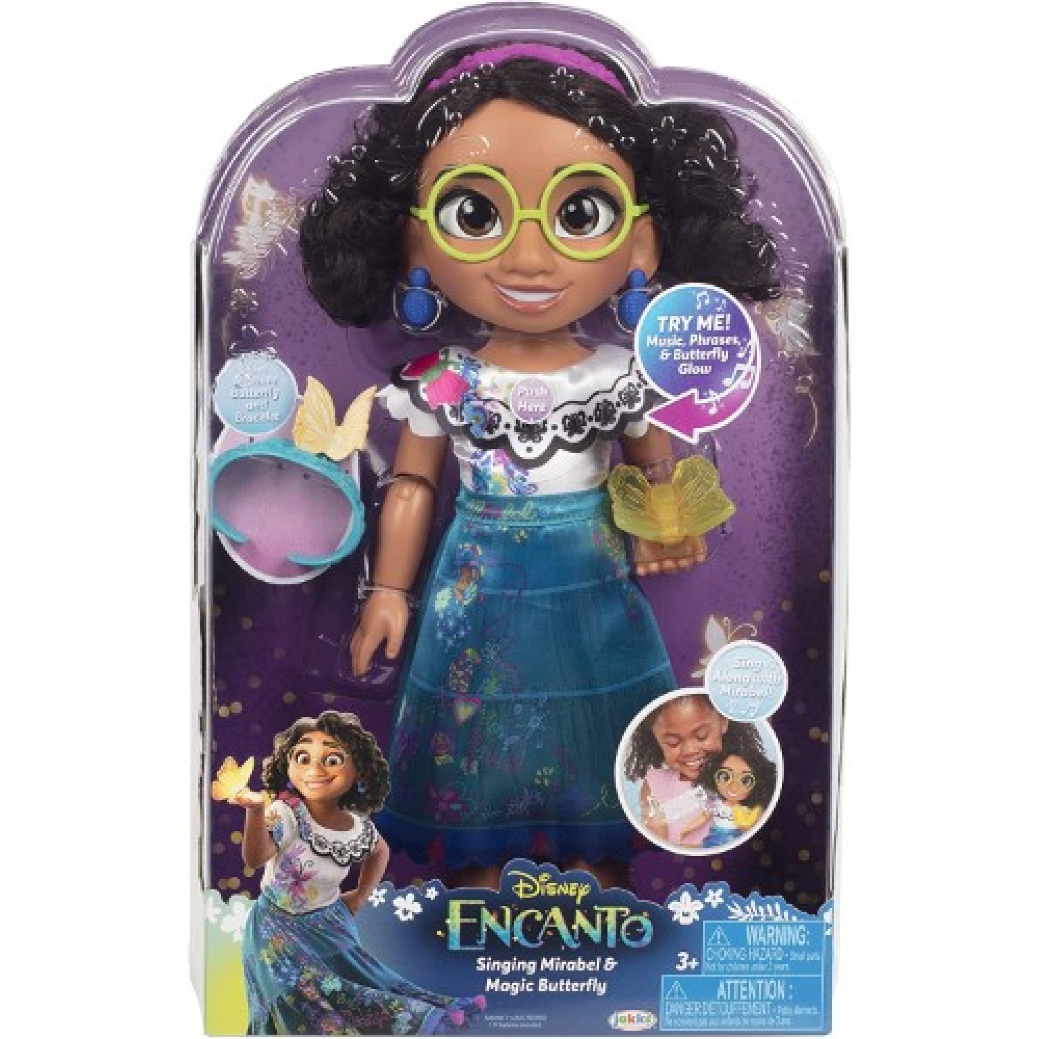 Muñeca inspirada por la película de Disney Encanto.Canta con Mirabel y verás brillar la mariposa posada en su mano, al son de la canción. Mirabel dice más de 10 frases de la película Encanto en Inglés, y es super articulada. La muñeca mide aproximadamente 35 cm de alto.