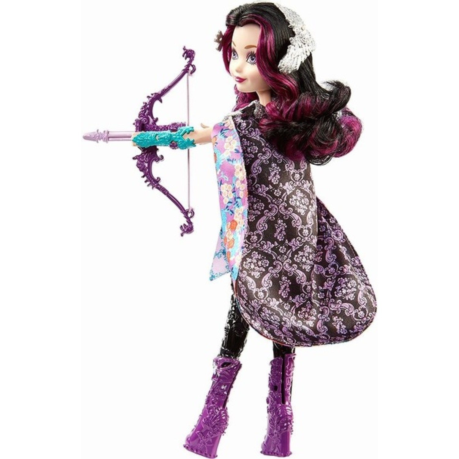 ¡Ayuda a la muñeca Raven Queen a dejar volar sus flechas y dejar volar tu imaginación! Un atuendo dos en uno se suma a la diversión del arco y flecha de trabajo al doblar la apariencia de la muñeca princesa Ever After High y la diversión narrativa. Pase de la ocasión real al arquero aventurero en un instante: la muñeca Raven Queen realmente dispara las flechas con su arco. La hija de la Reina Malvada de Blancanieves viste una fiesta con sus colores característicos: su corpiño morado tiene un detalle texturizado que combina con sus pantalones azules, una falda morada tiene un estampado floral colorido y una sobrefalda negra larga y cónica brilla con un rico estampado floral en morado ¡Pero cambia la apariencia en un instante! Quita la sobrefalda larga en la cintura (es una simple sujeción táctil) y ponla alrededor de su cuello para crear una hermosa capa: otro estampado floral en colores brillantes se asoma desde abajo para un efecto fabuloso feroz y la apariencia perfecta para el tiro con arco. Haz que la muñeca Raven Queen esté preparada para la práctica: coloca el arco cargado con una flecha en su mano izquierda, y coloca los dedos de su mano derecha en la ranura en la parte inferior de la flecha. Luego presiona el botón en su espalda para ver cómo tira la flecha hacia atrás y la deja volar. ¡Se incluyen tres flechas para que puedas trabajar en tu objetivo! Otros accesorios divertidos: un cuello de alado plateado, una diadema a juego y unas modernas botas recortadas, están a la altura. Vístase para la escuela, una pelota o un club de arquería. Practica el juego, apunta alto en la competencia o dispara para la aventura. ¡La muñeca de tiro con arco Ever After High Raven Queen realmente deja volar la diversión! Incluye la muñeca de Raven Queen con modas y accesorios que incluyen una falda / capa dos en uno, un arco de trabajo y tres flechas. Doll no puede pararse o disparar solo. Los colores y decoraciones pueden variar.
