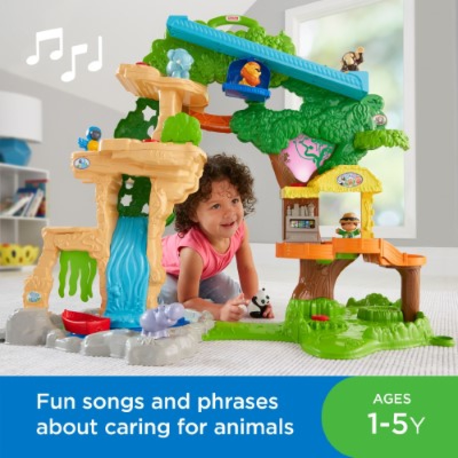 Leones, hipopótamos y elefantes, ¡ay! Con más de 2 pies de altura, con dos lados de juego y una variedad de luces, sonidos, canciones y frases emocionantes, el juego Safari Fisher-Price Little People Share & Care Safari está cargado de diversión salvaje para que su pequeña persona descubra. A medida que los niños pequeños exploran, los Botones de descubrimiento dan vida a cada área con luces, sonidos, acciones y canciones que ayudan a los niños a aprender cómo cuidar a los diferentes animales para hacerlos felices. Pequeñas cosas que hacen una gran diferencia. Respeto por los animales: a medida que los niños pequeños visitan el hábitat, las canciones y frases cantadas les ayudan a descubrir lo que varios animales salvajes necesitan para ser felices. Juego imaginativo: con figuras fáciles de entender, los niños pequeños pueden usar su imaginación para crear historias mientras juegan. Motricidad fina: las manos pequeñas hacen un gran ejercicio al agarrar e interactuar con las figuras, fortaleciendo la destreza y la coordinación mano-ojo. Fisher-Price Little People Share & Care Safari Juego interactivo de luces y sonidos: Rango de edad: 1 a 5 años ¡Más de 2 pies de altura con 2 lados de juego, 5 activaciones y 6 hábitats de animales diferentes! Luces interactivas y divertidas canciones, sonidos y frases enseñan todo sobre diferentes animales Pantalla de computadora emergente con datos de animales, tirolesa de trabajo, cascada de caída y arbusto peek-a-boo ¡Combina cada animal con su hábitat! Enredaderas suaves de la jungla y cuenca de agua giratoria Incluye 1 guía de Safari y 6 figuras de animales (los animales adicionales se venden por separado)