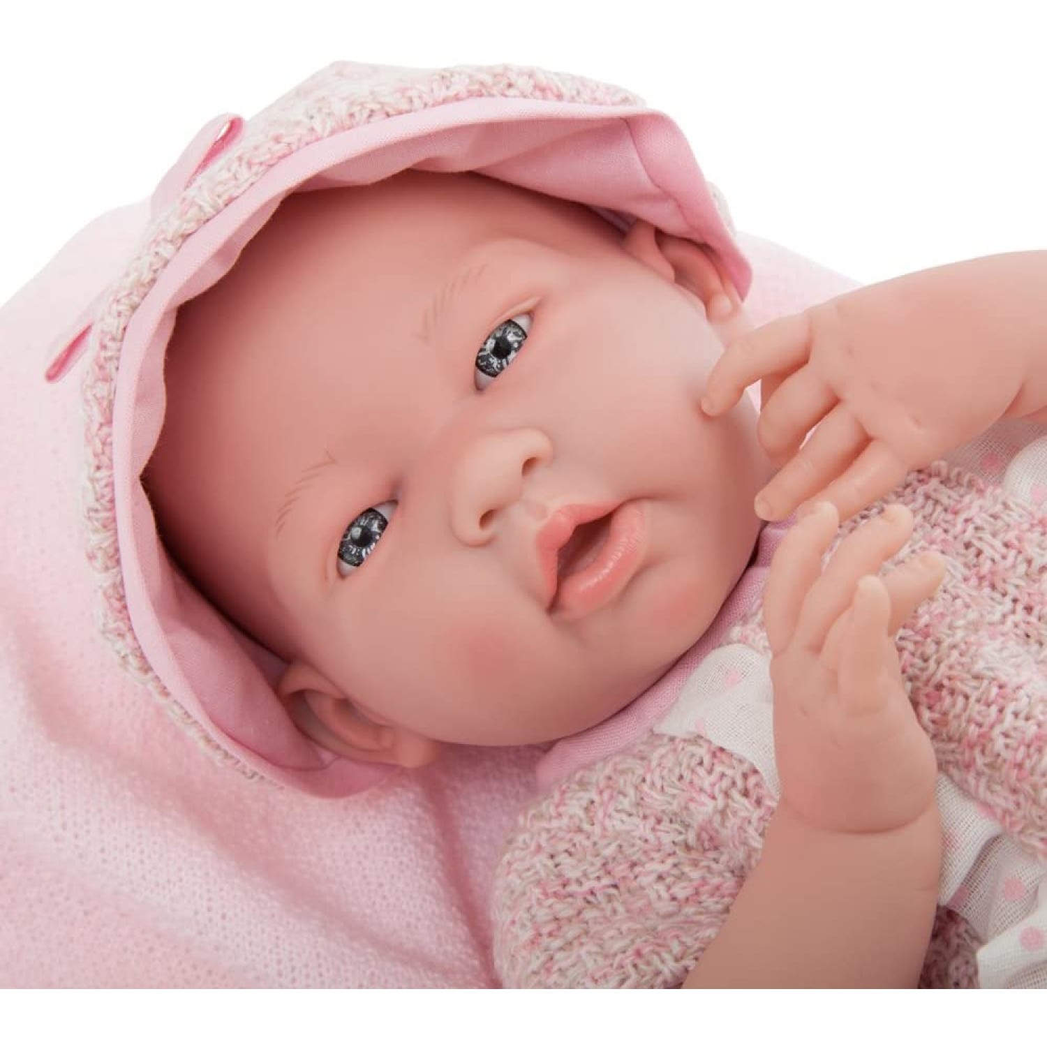 Muñeca de vinil que mide 38 cms con piernas, cabeza y brazos móviles. Luce como una bebé real con pliegues y arruguitas. Incluye mantita.