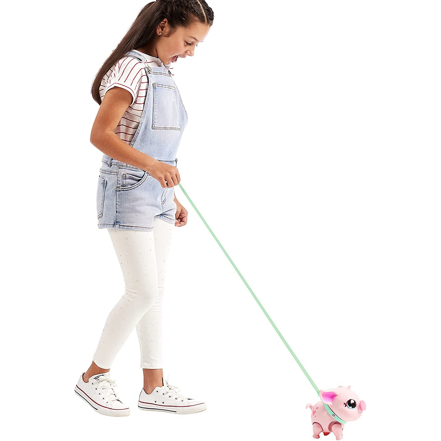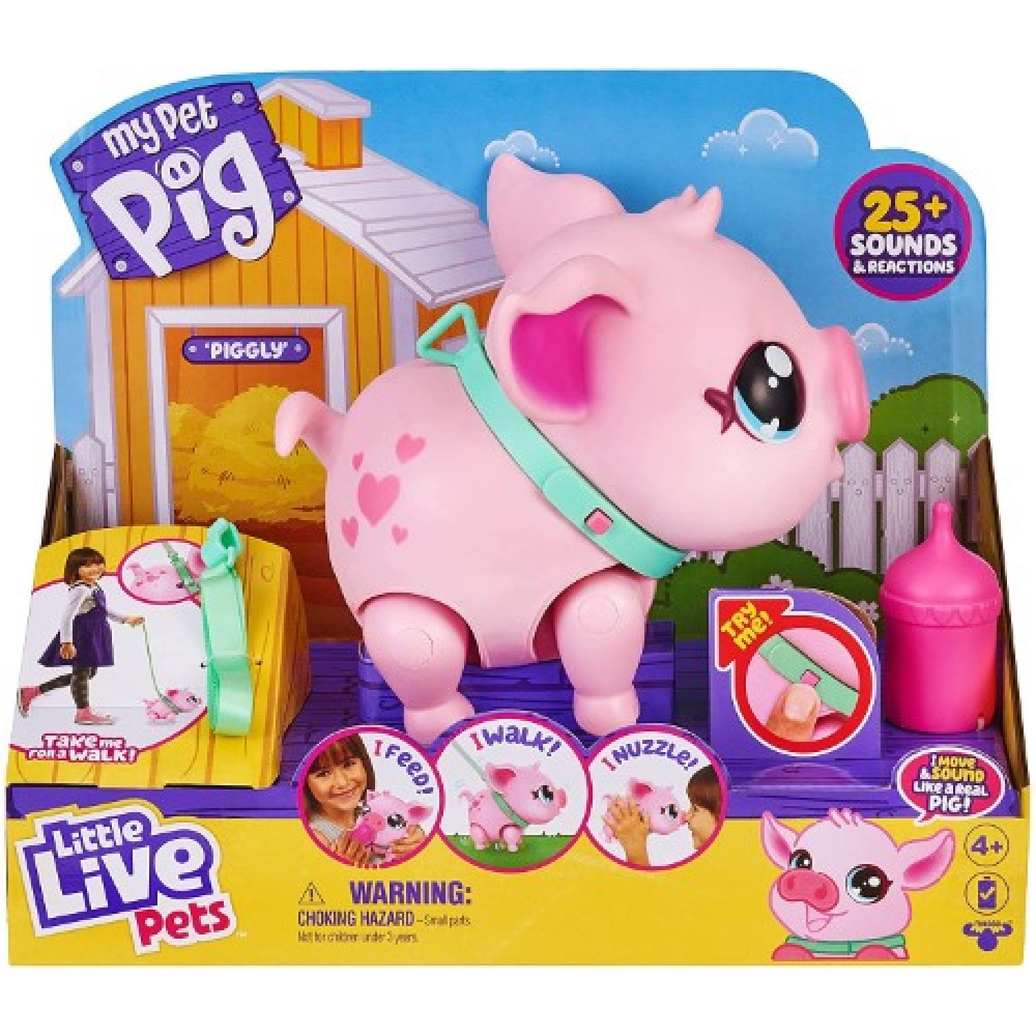 Piggly es tu nueva mascota interactiva que suena y se mueve como un cerdito bebé real. Dale de comer con su tetero y dale un abracito, mientras reacciona a tu caricia. ¡Acerca tu nariz a su hocio y te dará un dulce besito! Piggly hace más de 25 divertidos sonidos: Hace oinks, come, se ríe, erupta, olfatea, estornuda, e incluso puede dejar salir un pedito, también! Piggly tiene una piel súper suave y orejas que se menean cuando camina.