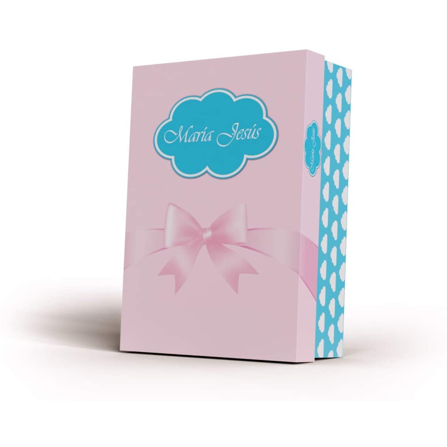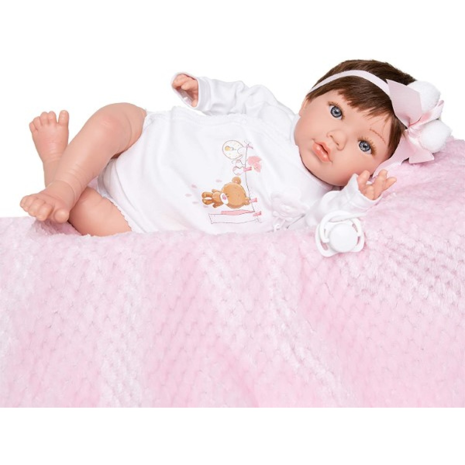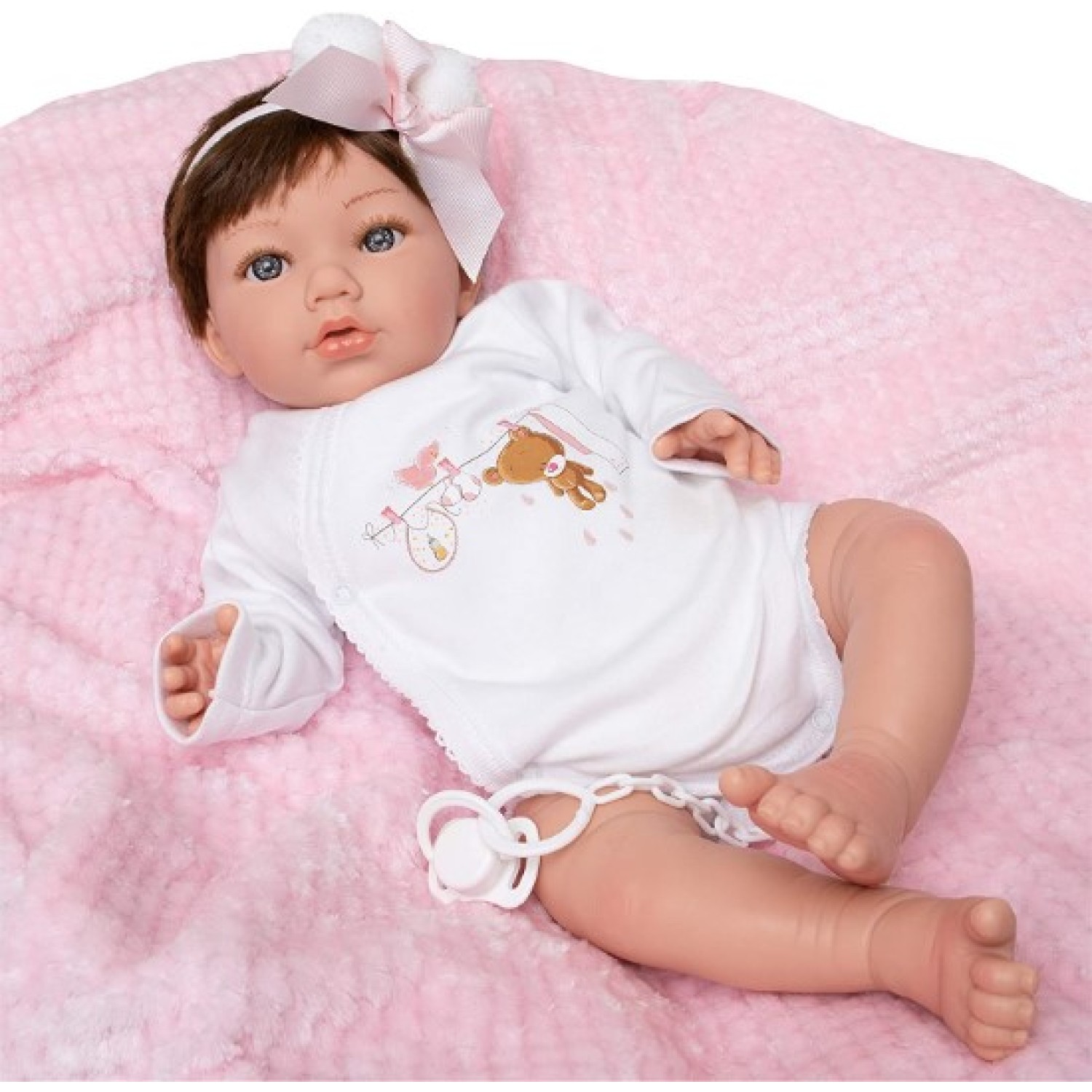 Bebé reborn de 48 cm de largo con cuerpo de tela y extremidades de vinilo; con ojos abierto, pelo castaño y caja de lujo.