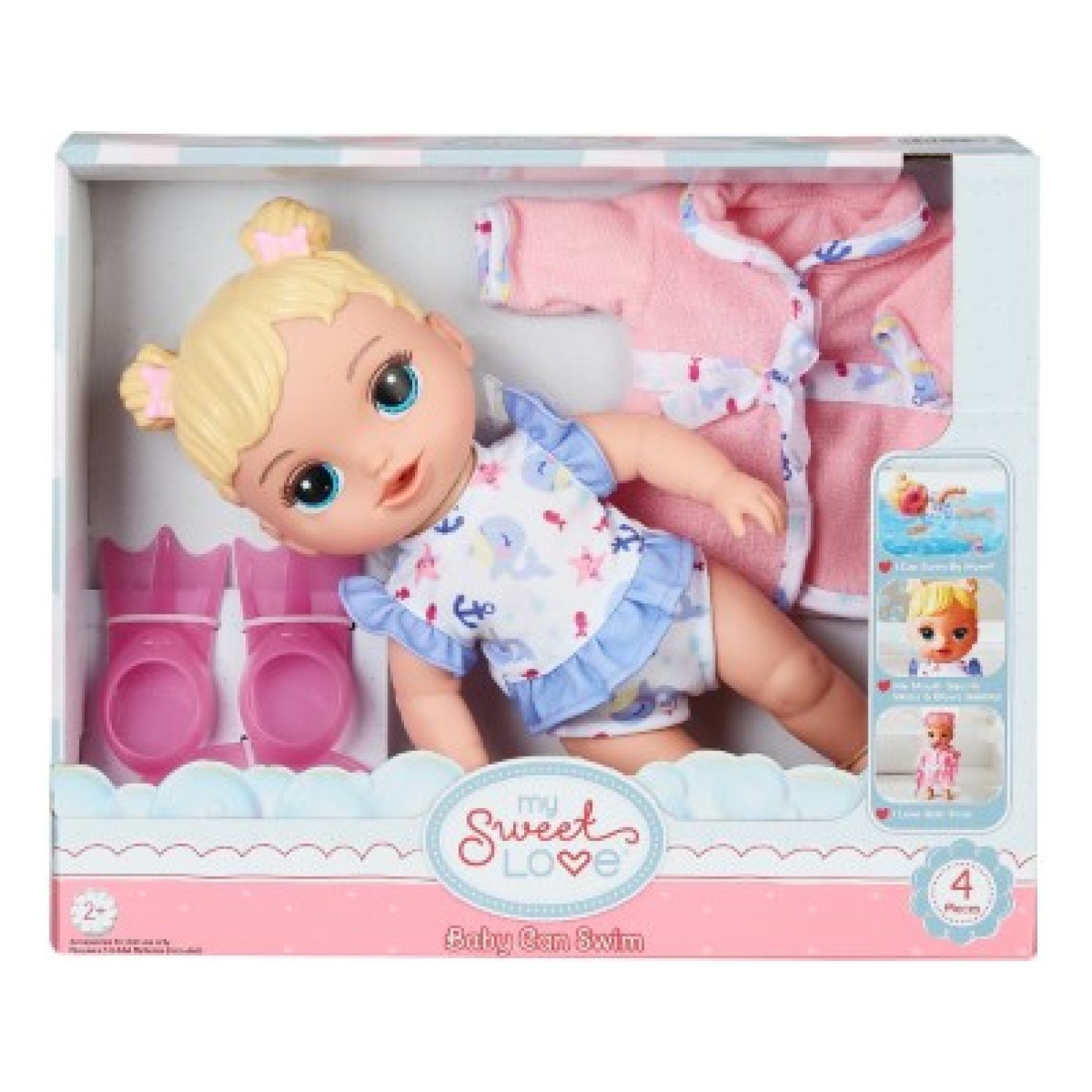 Su hija podrá jugar a enseñarle a nadar a la muñeca "My Sweet Love Baby Can Swim". Este producto se compone de una muñeca My Sweet Love de 30 cm de alto que viste un colorido traje de baño, máscara de baño, aletas y bata. Con 3 pilas incluidas, la muñeca puede arrojar agua por la boca y nadar por sí sola en el bañera, lavabo u otros cuerpos de agua.