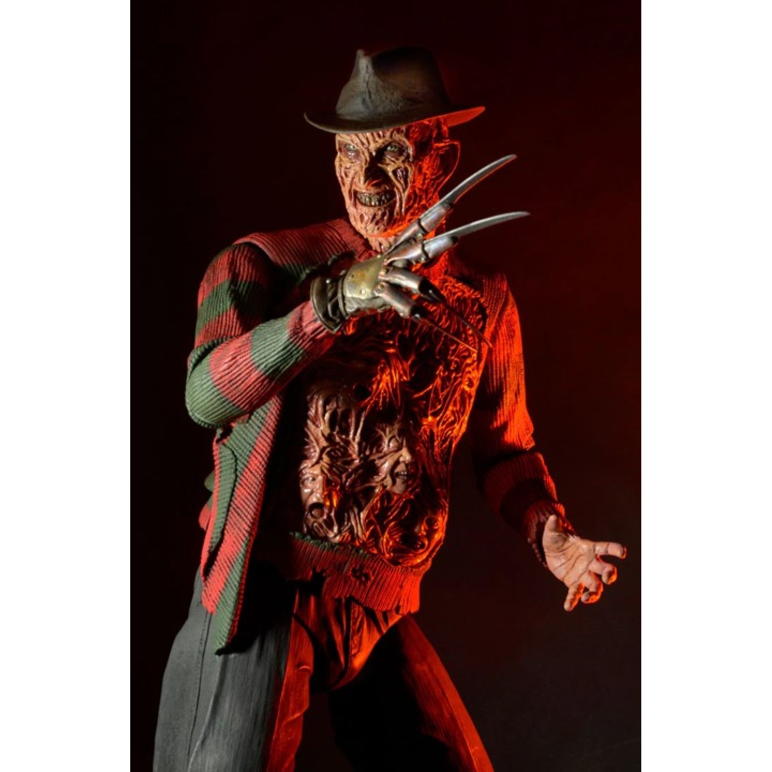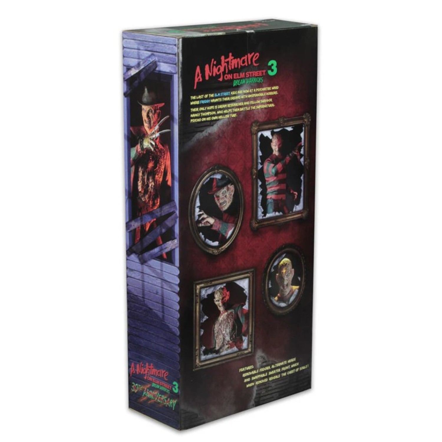Figura de 45,72 cm con puntos de articulación, cabeza y pecho intercambiables inspirada por la película Pesadilla en Elm Street de 1987 parte 3: Dream Warriors. Figura de celebración 30 aniversario.