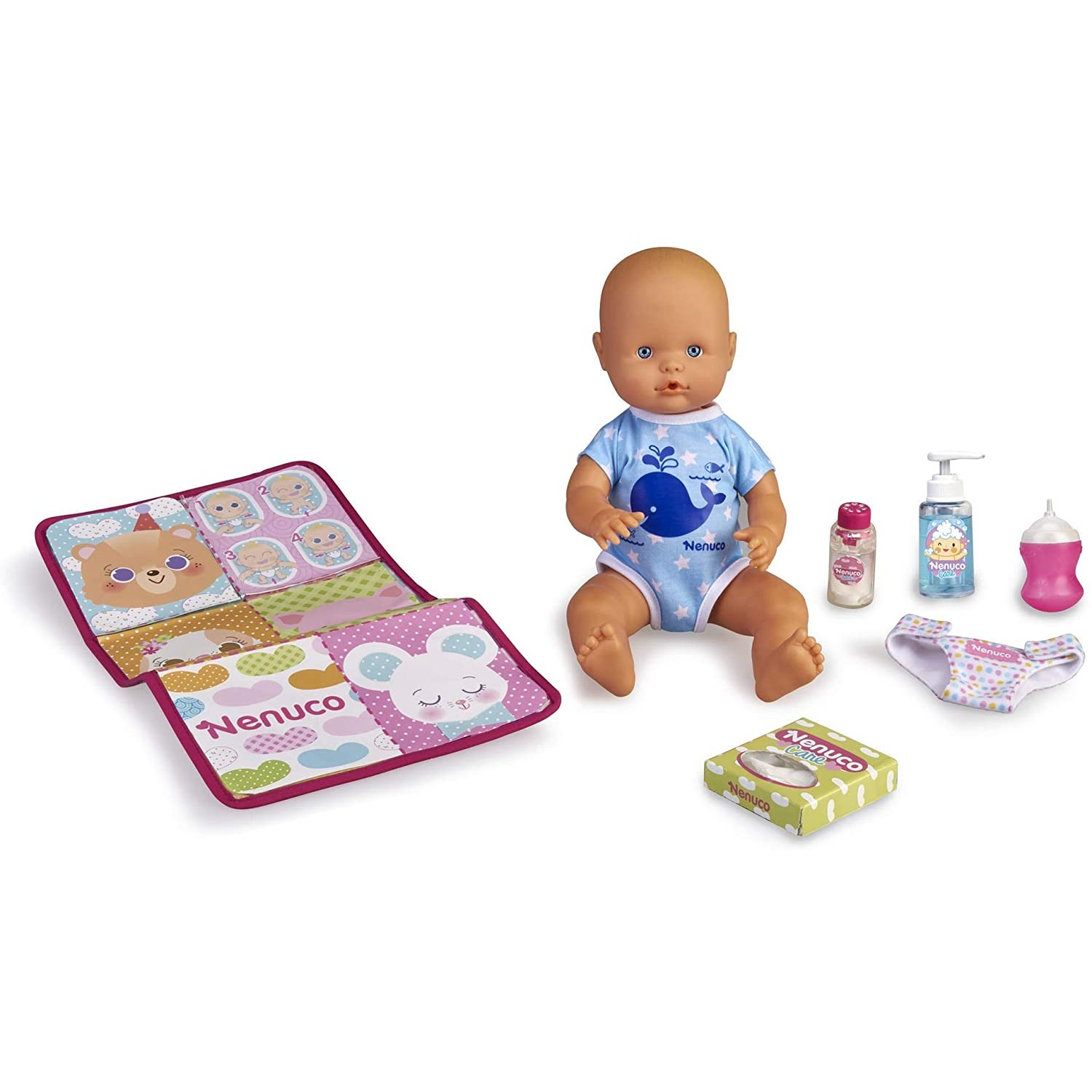 Esta muñeca es un bebé varoncito. Si acuestas a Nenuco en su colchonetica, y les da de tomar su tetero aguanta las ganas de orinar. Si aprietas sus piernecitas hacia adentro, sale un chorrito de pis.
