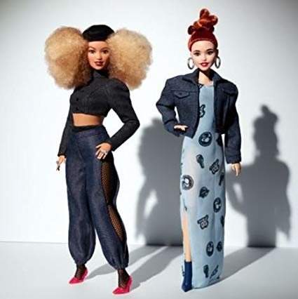 Una de las dos muñecas de la mini colección, luce un denim oscuro, un top de cuello alto de manga larga con vaqueros estilo harén sobre medias de red negras, todo con puntiagudas zapatillas rosa brillante. Su afro está acentuado con una boina estilizada.