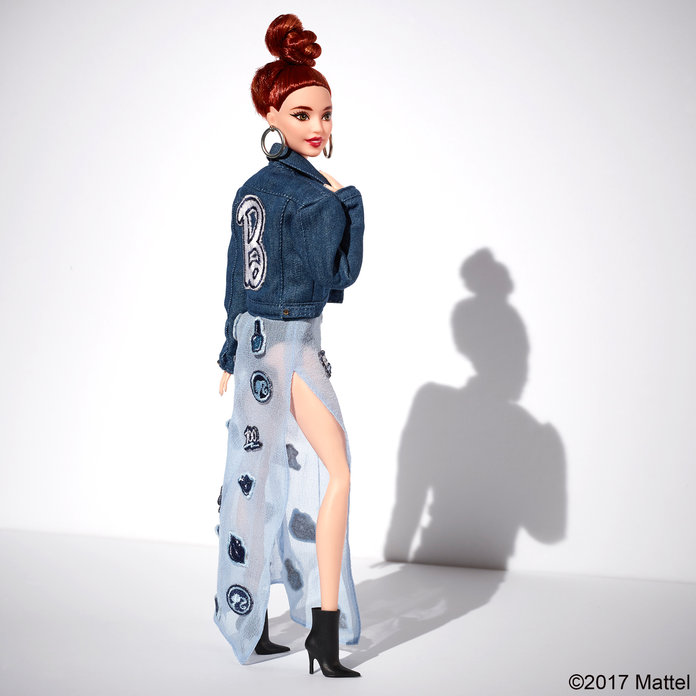La segunda muñeca Barbie lleva una chaqueta de mezclilla de gran tamaño estampada con una "B" en la espalda y un vestido maxi azul transparente con iconos dispersos de Barbie relacionados con la belleza. Aretes grandes y botines azules complementan su apariencia, y su cabello castaño rojizo está diseñado y trenzado en el moño de moda.