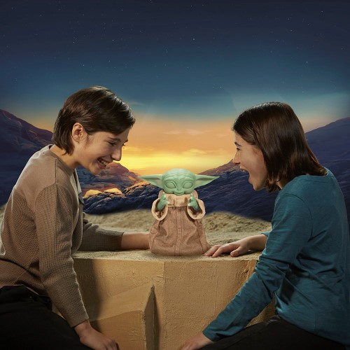 STAR WARS GALATIC SNACKIN' BABY YODA, es un muñeco animatrónico que funciona con baterías cuenta con sonidos y movimientos que asemejan las características de la criatura de la serie televisiva. Cuando acercas a su boca el macarón a su boca hace gestos y ruidos de alguien que tiene hambre. Hace levitar objetos, y hace ruiditos tal como lo hace Grogu en la serie "The Mandalorian".
