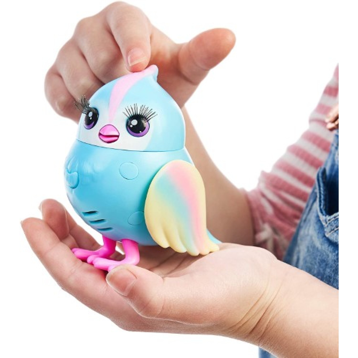 Pájaro interactivo con más de 20 sonidos que reacciona a las caricias y gira su cabeza. Mantén presionado el botón del pecho y escucharás que dice, tocalo y lo escucharás gorgojear y cantar. Juguete ideal para exhibición.