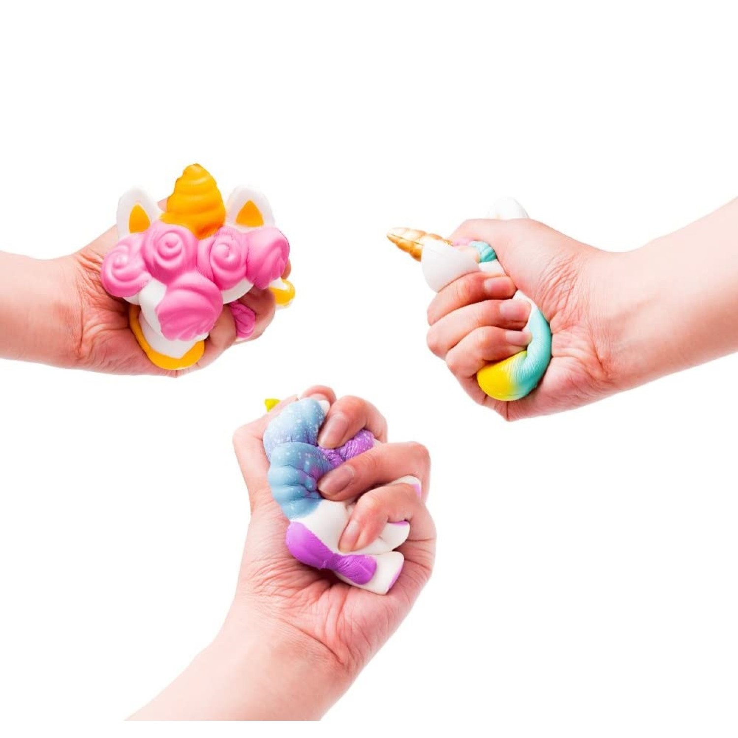 Conjunto de 4 juguetes antiestres apretables, con estética unicornio que miden alrededor de 12 cm cada uno. Diseños y colores pueden variar.