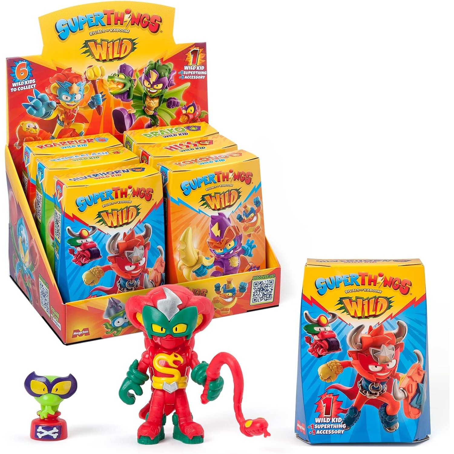 Caja con la colección completa los 6 Wild Kids. Cada empaque individual contiene 1 Wild Kid, 1 accesorio de combate, 1 Superthing exclusivo y 1 checklist. Cada figurita mide alrededor de 8 cm.