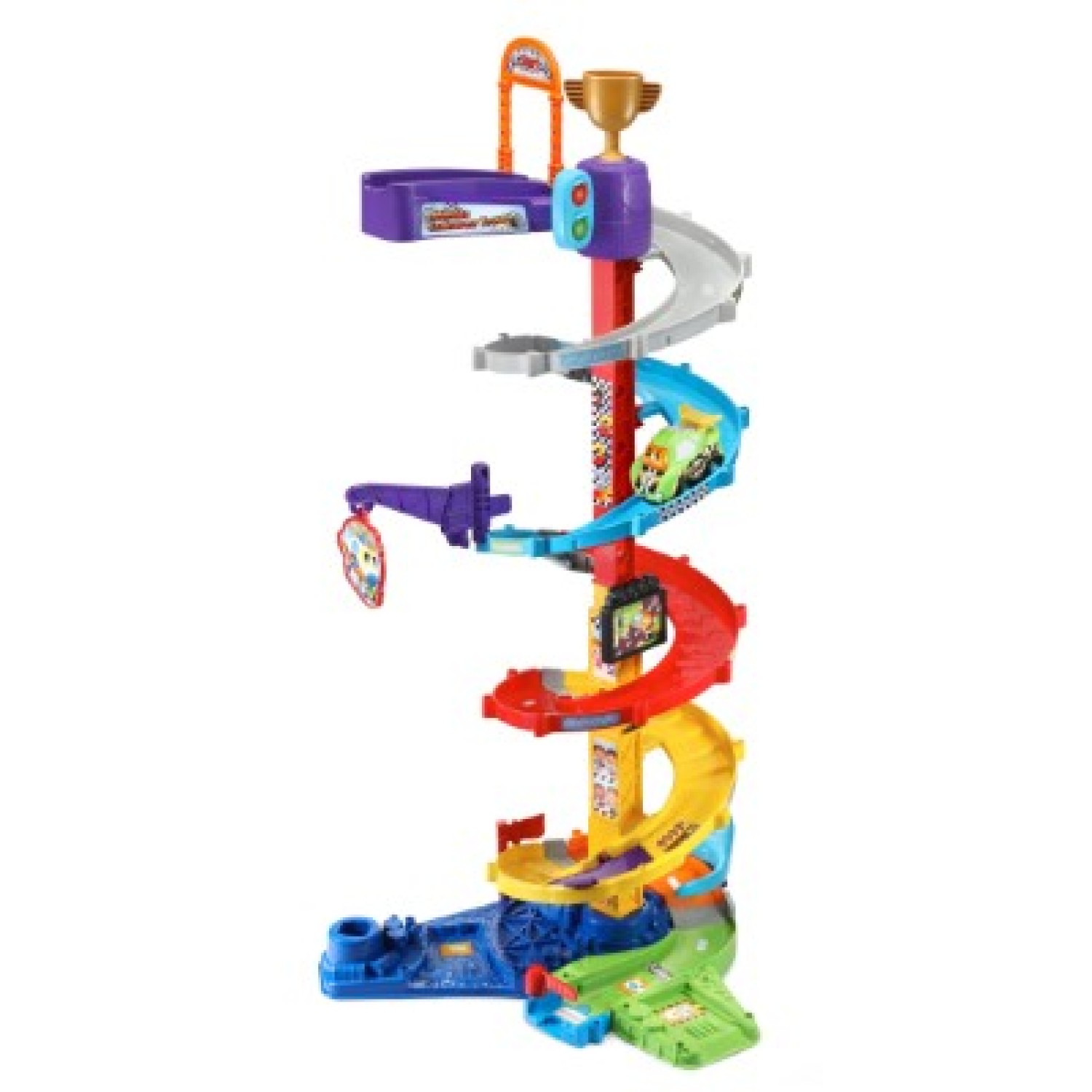 Pista de juguete Vtech, en forma de torre en espiral, que puede ser transformada en distintos escenarios de juego, para fomentar el desarrollo de habilidades motoras y finas, y la resolución de problemas. Incluye a Rocky The Race Car; presiona el botón en su parabrisas, para aprender sobre la letra "R" y para escuchar 3 canciones y 6 melodías musicales. Además, la pista cuenta con cinco (5) puntos SmartPoints, que reproducen una gran variedad de efectos de sonido, canciones, melodías, y frases, cuando los vehículos pasan sobre ellos. Funciona con 2 baterías AAA. Rango de edad: Mayor a 1 año.